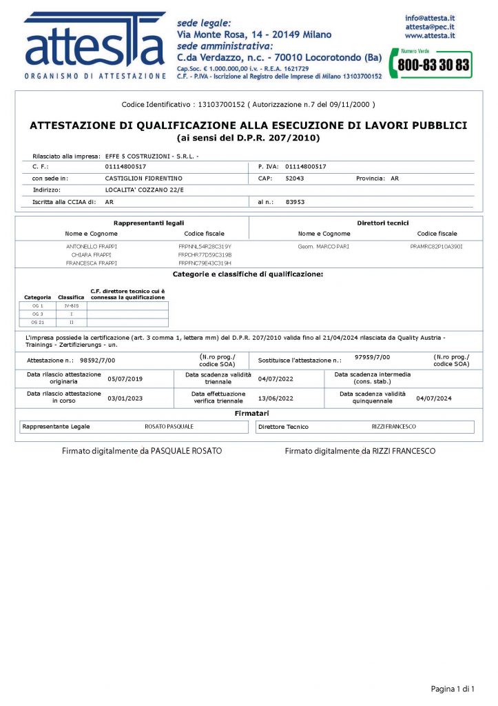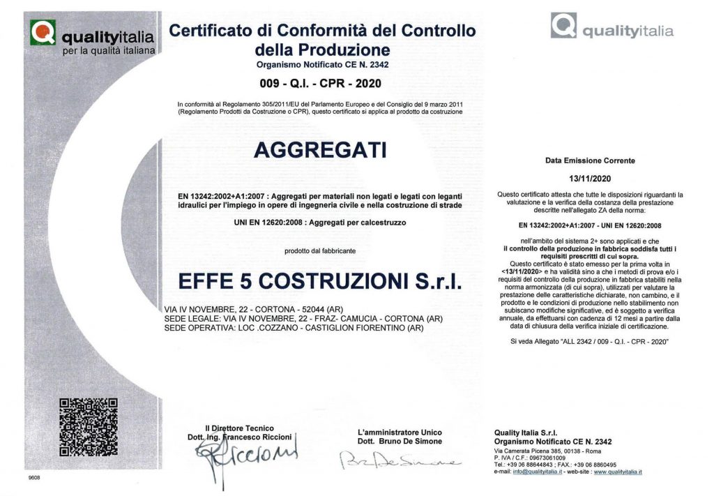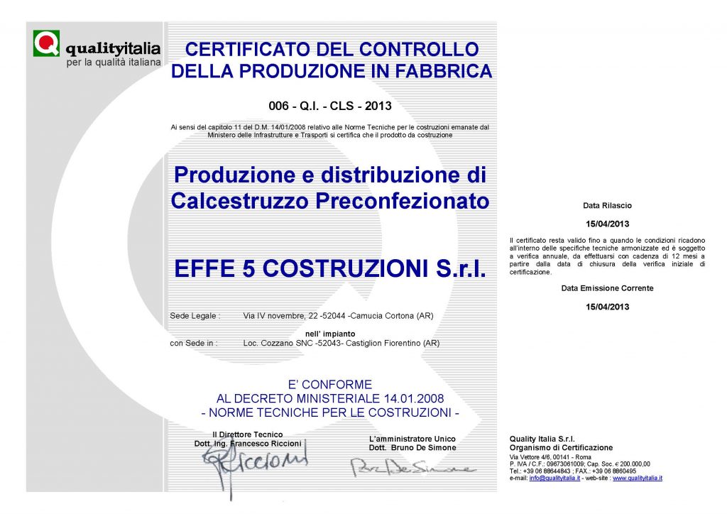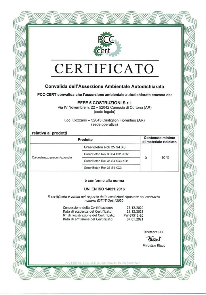 Certificazioni ATTESTATO SOA ATTESTAZIONE DI QUALIFICAZIONE ALLA ESECUZIONE DI LAVORI PUBBLICI(ai sensi del D.P.R. 207/2010) PERRY JOHNSON REGISTRARS, INC. Sistema di di Gestione Salute e Sicurezza CERTIFICATO DEL CONTROLLO DELLA PRODUZIONE IN FABBRICA 006 - Q.I. - CLS - 2013 Produzione e distribuzione di Calcestruzzo Preconfezionato CERTIFICAZIONE ISO 9001 Sistema di Gestione della Qualità in conformità standar ISO 9001:2015 Certificato PCC-CERT EN ISO 14001:2015 Opera secondo un Sistema di Gestione Ambientale Conforme alla Norma: EN ISO 14001:2015 Certificato Controllo delle Produzione 009-Q.I. - CPR - 2020 Certificato Controllo delle Produzione 009-Q.I. – CPR – 2020 su prodotti AGGREGATI Certificato dell'Assezione Ambientale Autodichiarata iso 14021:2016 Certificato dell’Assezione Ambientale Autodichiarata iso 14021:2016 per Calcestruzzo preconfezionato